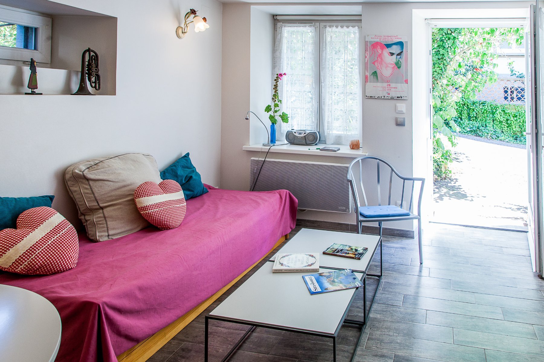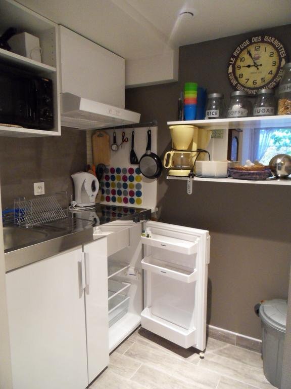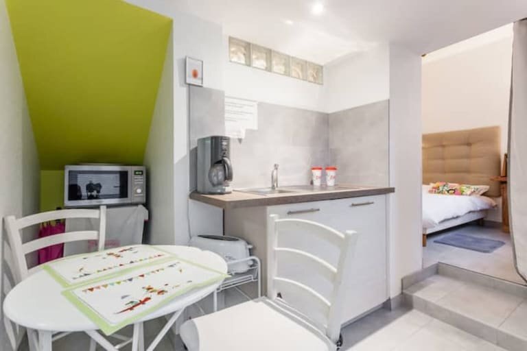 Le studio des musiciens est composé d’une chambre meublée avec salle de bain et une cuisine équipée afin de se préparer de petits repas à déguster sur place sur la grande table ronde. Le wc privatif est séparé par une porte. L’appartement est doté d’une petite terrasse pour rêver dans la verdure.